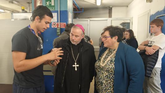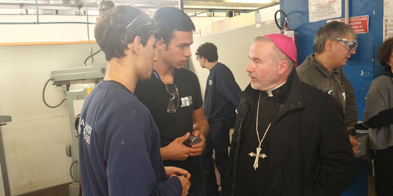 Mons. Salera prima ascolta la storia che ragazze e ragazzi hanno da raccontare rispetto al loro percorso di formazione professionale e poi pone alcune domande sulle competenze che stanno sviluppando, soffermandosi sul significato che assume l'accrescimento professionale in un contesto di crescita personale.