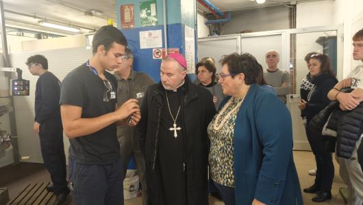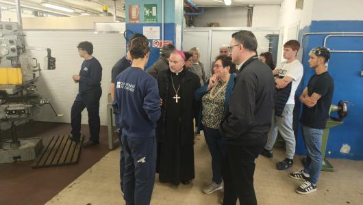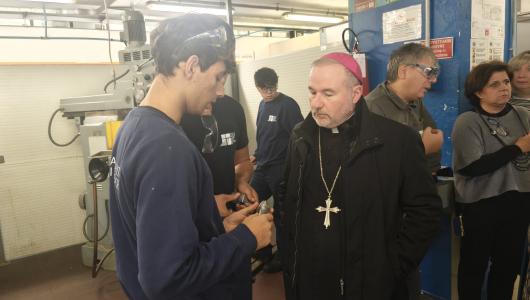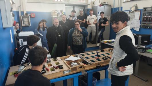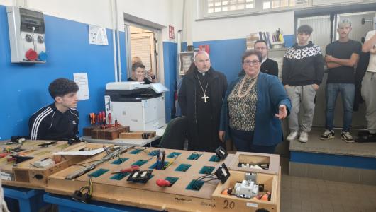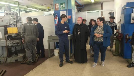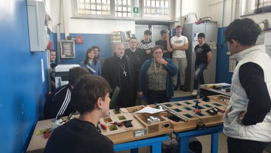 Mons. Daniele Salera osserva da vicino i lavori in corso nei reparti elettrico, PLC, meccanico e delle produzioni alimentari, soffermandosi con curiosità sulle attività pratiche e sui progetti dei ragazzi.